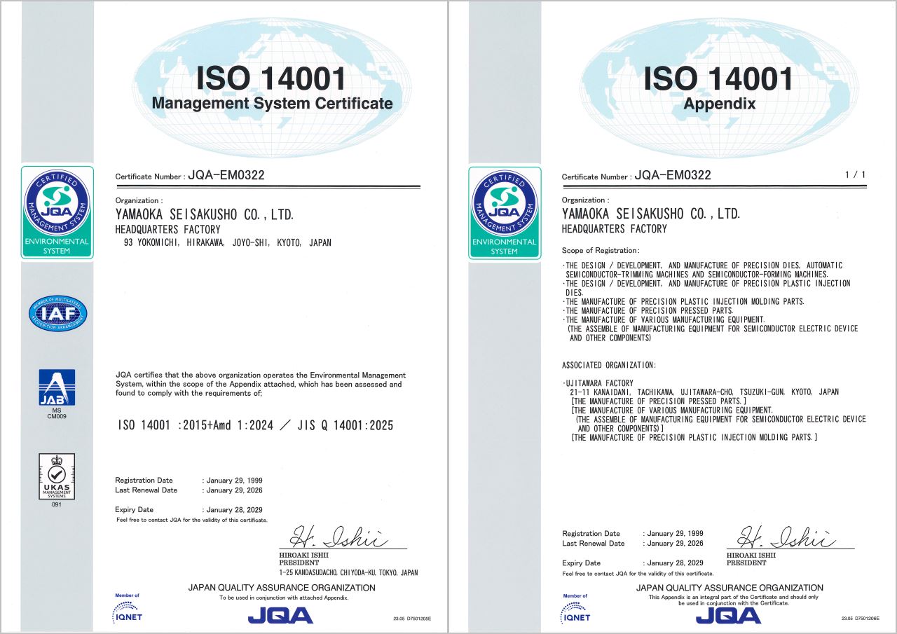We acquired in 1997 the ISO9001 (quality management system) and in 1999 the ISO14001 (environment management system) delivered by the Agency for International Standardization. We do efforts to provide high-quality products and to reduce the effects on environment, by permanent exercise of both standards.